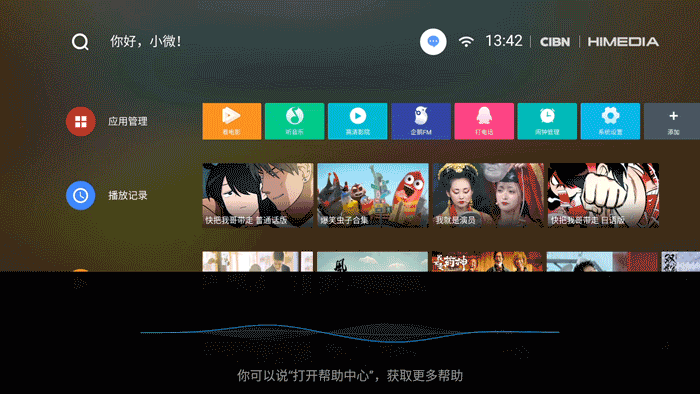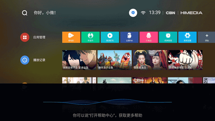 與外觀的簡單素樸的風格一致,海美迪小白盒的UI界面非常簡潔,最上面一欄可以看到搜索、智能語音“你好,小微”提示語,內(nèi)容來自CIBN牌照方。